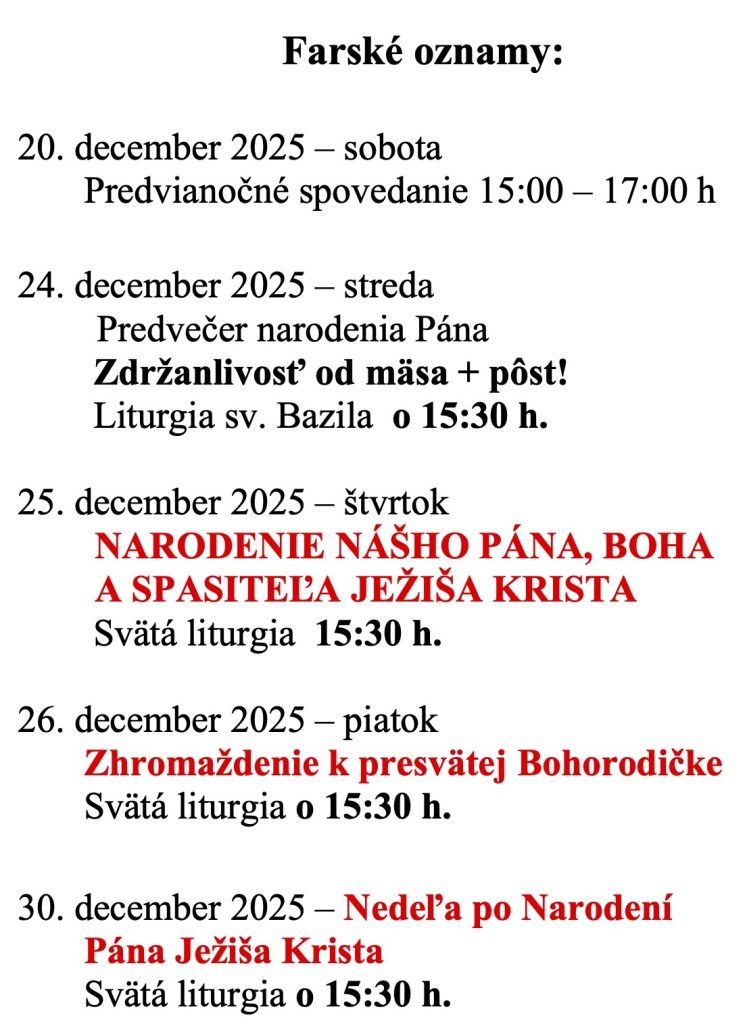 | 25.12. | Narodenie podľa tela nášho Pána, Boha a Spasiteľa Ježiša Krista |