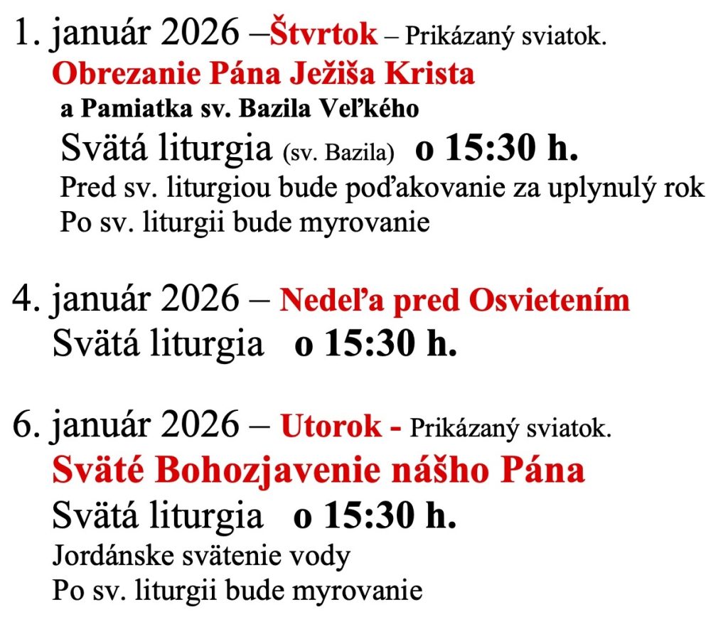 | 6. 1. | Sväté Bohozjavenie nášho Pána, Boha a Spasiteľa Ježiša Krista |